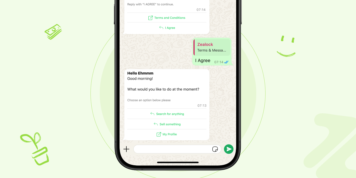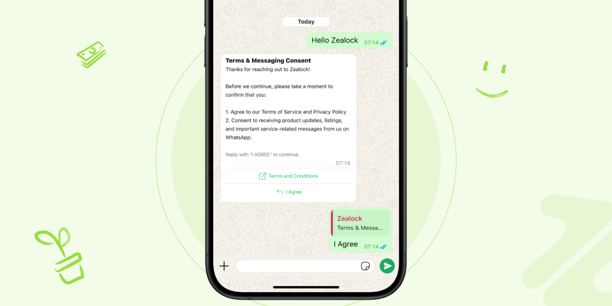 After you send your first message, you’ll receive a prompt to agree to our terms of service. This ensures a safe and trusted experience for everyone on Zealock and is in line with WhatsApp's policies.